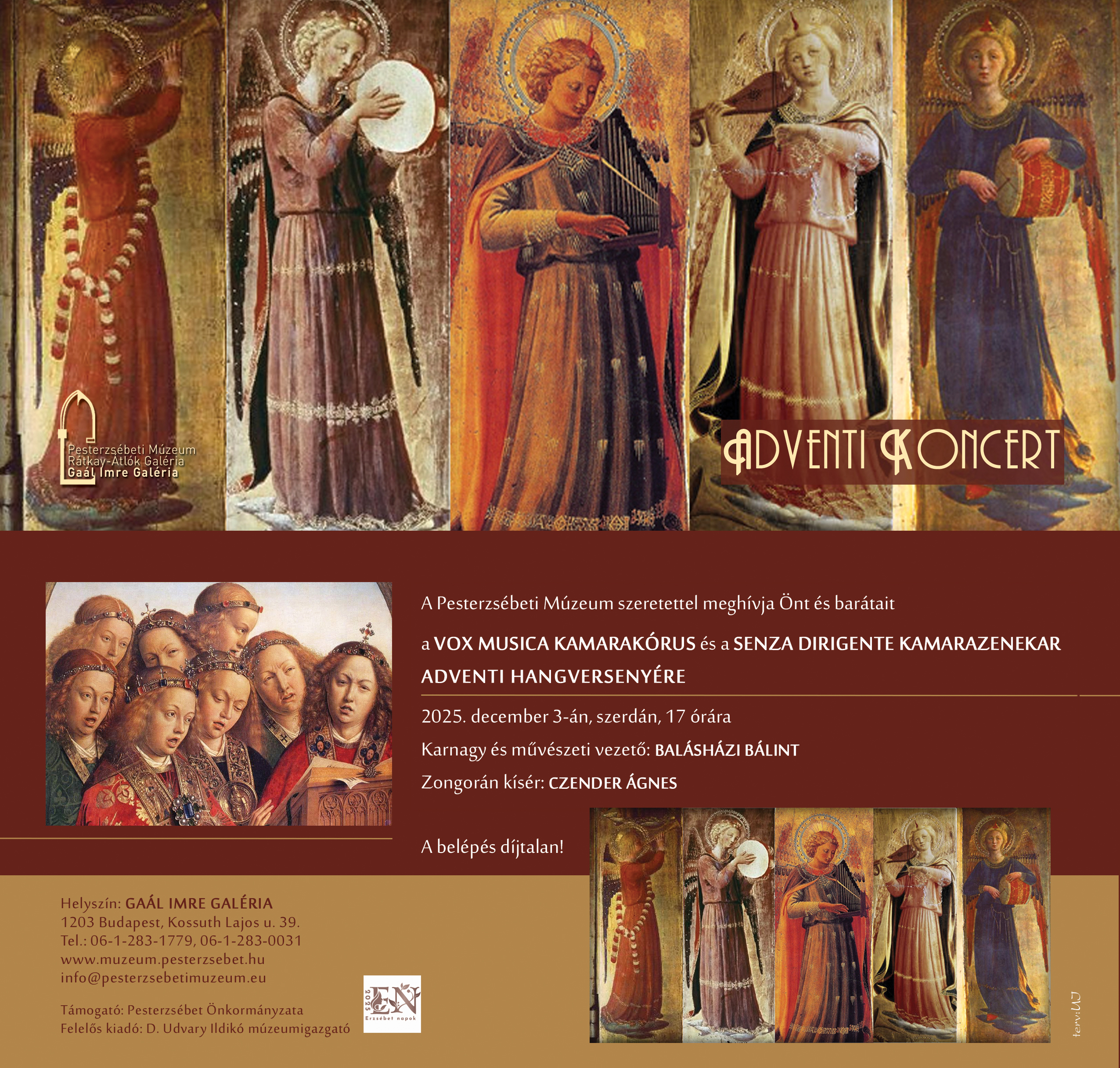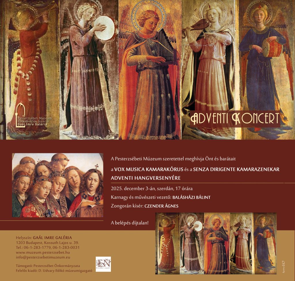 A VOX MUSICA KAMARAKÓRUS és a SENZA DIRIGENTE KAMARAZENEKAR adventi hangversenye. Időpont: 2025. december 3., szerda, 17 óra Helyszín: Gaál Imre Galéria A belépés díjtalan!