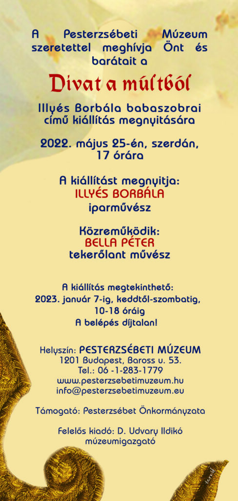 Időszaki kiállítás a Pesterzsébeti Múzeumban. Megtekinthető: 2022. május 25- december 17-ig. A kiállítás zárása a meghívóban olvasható időponthoz képest megváltozott a téli bezárás miatt. Megértésüket köszönjük!