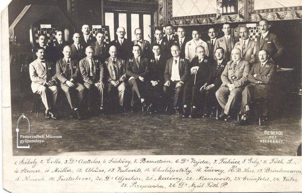 A felvétel 1927-ben Kecskeméten készült, egy nemzetközi sakkversenyen. A 6-os számú „szereplő” Dr. Vajda Árpád (1896-1967), az erzsébeti illetőségű világhírű sakkozó. (Az összesített eredmény alapján 6. helyen végzett, a versenyt a 20-as számmal jelölt Aljechin nyerte meg.)