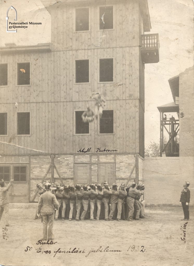 Az 1932-es fotó a Pestszenterzsébeti (eredetileg Erzsébetfalvai) Önkéntes Tűzoltó Testület alapításának 50. évfordulóján készült. 1882 szeptemberében Suda János elnökletével és Stonavszky Manó parancsnokságával szerveződtek meg a „lánglovagok”. A felszerelés kezdetben egy mozdonyfecskendőből, 60 m nyomótömlőből és 1 gráci dugólétrából állt, amelyek az Uri utcában, egy fabódéban voltak elhelyezve. 1892-ben Suda Kálmán Posta utcai telkén épült fel az első szertár. Az erzsébetfalvai szervezet 1920-ban / 1921- ben olvadt össze az 1887-ben megalakult Kossuthfalvai Önkéntes Tűzoltó Testülettel. A székház valamint a jól felszerelt szertár az Attila utcában állt. A laktanyában éjjel – nappali tűzőrségi és mentőszolgálat működött.