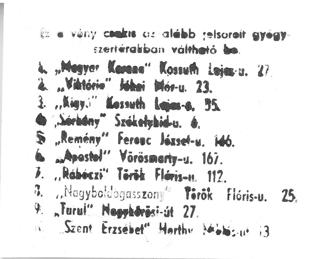 Ez a vény csakis az alább felsorolt gyógyszertárakban váltható be:
