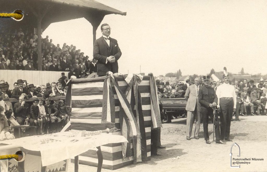 A díszes pulpitoson állva éppen dr. Chikán Béla, Pesterzsébet polgármestere és nem mellesleg a testnevelési bizottság elnöke mondja el ünnepi beszédét. Ebben a magyar becsületre, a zászlóhoz való hűségre és „a szebb jövő munkálására” lelkesítette a fiatalokat. A szónoklat után dr. Chikán Béláné zászlóanya adta át a leventéknek a lobogót.